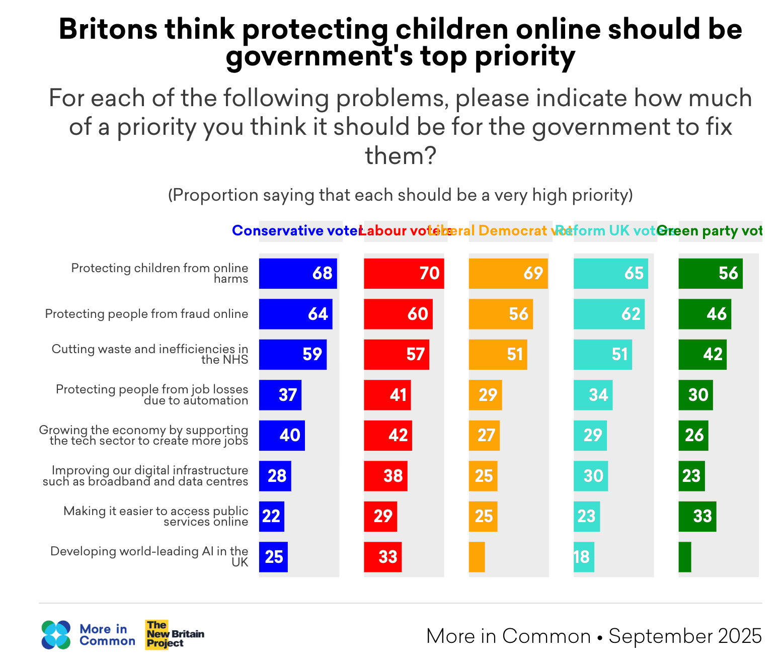 There’s an urban-rural divide in Britain across views of the merits of new technology, according to new research from More in Common. However, Britons are far more likely to say that technology makes them feel connected to others, rather than lonelier, especially among the younger generations. There’s an even stronger divide when it comes to AI, with Gen Z twice as likely as the rest of the public to use AI to learn, create, write, or even provide emotional support. Older generations (Gen X (!) and up), meanwhile, say that they use AI sparingly if at all. Of all the roles respondents would least like to see replaced with AI, teachers win resoundingly, with 69% saying that we should never explore or consider AI chatbots instead of teachers in the classroom. Protecting children from harm is the top priority for government in relation to technology: